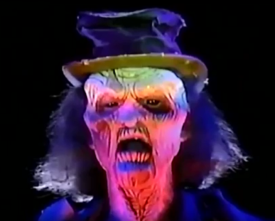 Another feature of the VHS series that was absent from my viewing of the DVDs was the progressive changing of the host along the hour of play. With the Gatekeeper we saw a basically normal man become more and more monstrous until finally his eyes had become demonic and his skin an unhealthy shade. With Zombie they stepped up the game and had the Baron progressively rotting. At first it is not noticeable, but by the end he's pretty nasty.